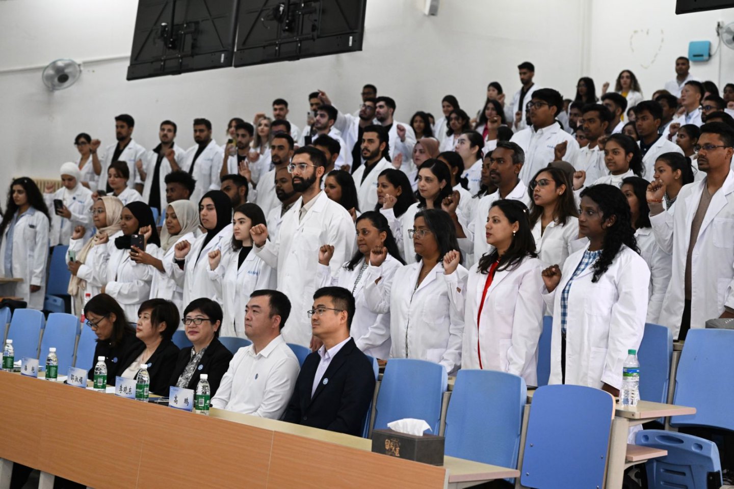 随后,在校留学生代表、2022级临床医学专业本科生普尔同学分享了自己在校学习与生活的宝贵经验,为学弟学妹们提供了有益的借鉴。新生代表、2025级外科学博士那米同学在发言中表达了对于学业的憧憬与决心,并代表全体新生承诺将恪守校规,勤奋求学。
