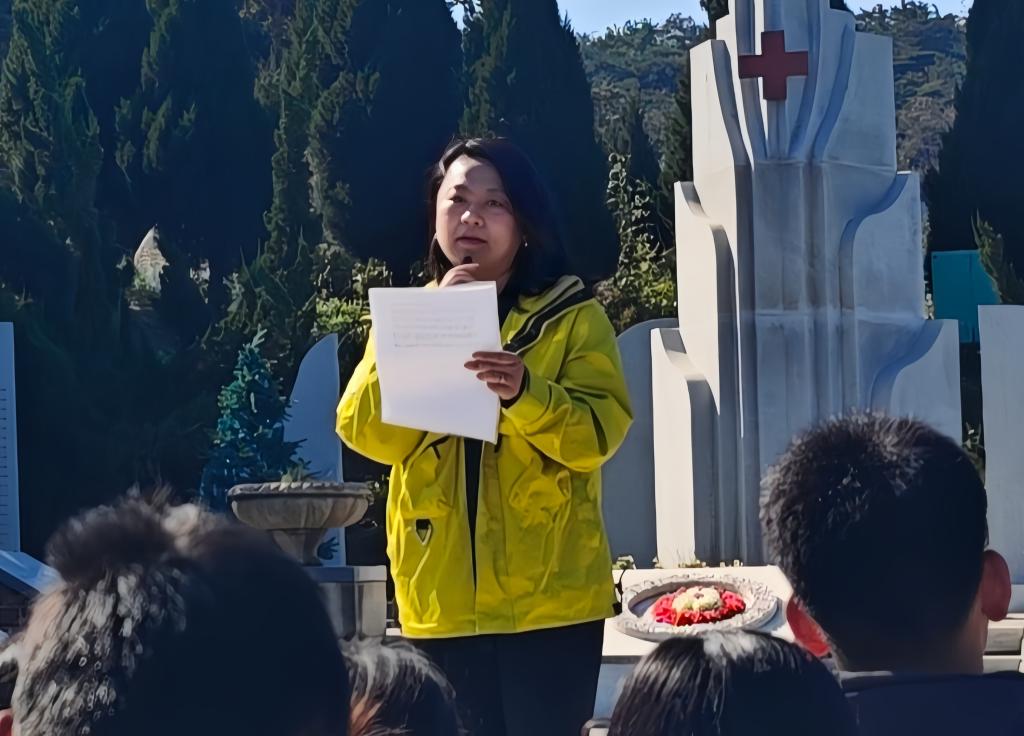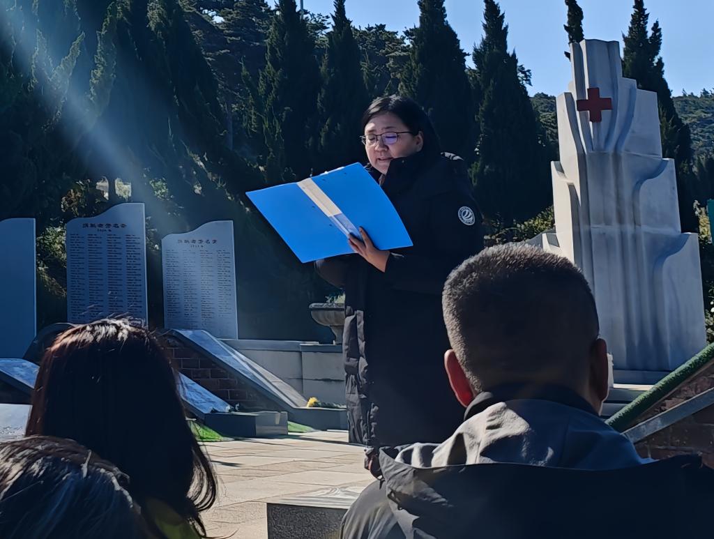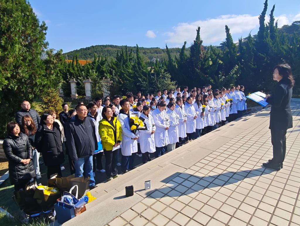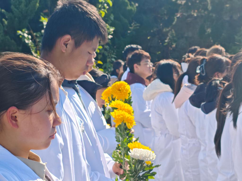 为了激发医学生的责任感和使命感,培养医学人文精神,10月18日上午,学校马克思主义学院联合第二临床学院、麻醉学系、护理学院组织部分师生前往大黑石将军山遗体捐献者公墓开展感恩“无语体师”集体悼念活动。此次活动是思想道德与法治课实践教学的精品项目之一。马克思主义学院领导班子成员、部分思政课教师,护理学院辅导员、研究生,2025级临床医学、麻醉学以及护理学专业本科生等80余名师生参与此次活动。活动还特别邀请了我校遗体捐献者家属徐女士,和医学生们共上了一场特别的“思政课”。