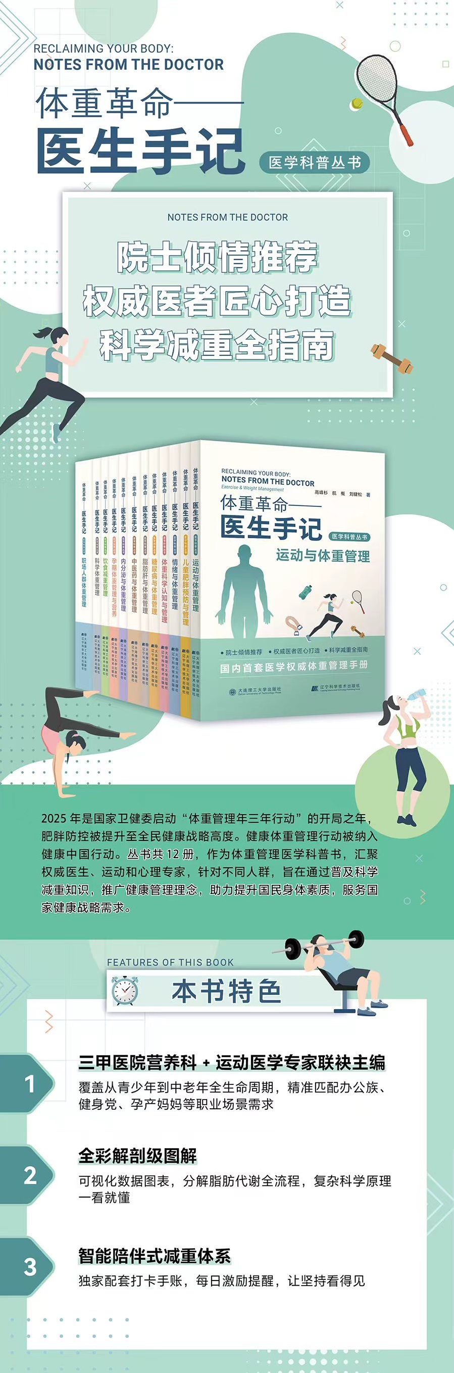 这套丛书的诞生,积极响应了国家卫生健康委“体重管理年三年行动”的号召,得到了出版方大连理工大学出版社的大力支持,也是两所高等学府跨学科深度合作的智慧结晶。丛书历时半年完成“三审三校”,充分体现“学术有支撑、生活用得上”的创作宗旨。希望丛书能走进千家万户,传递专业性的科学健康理念。