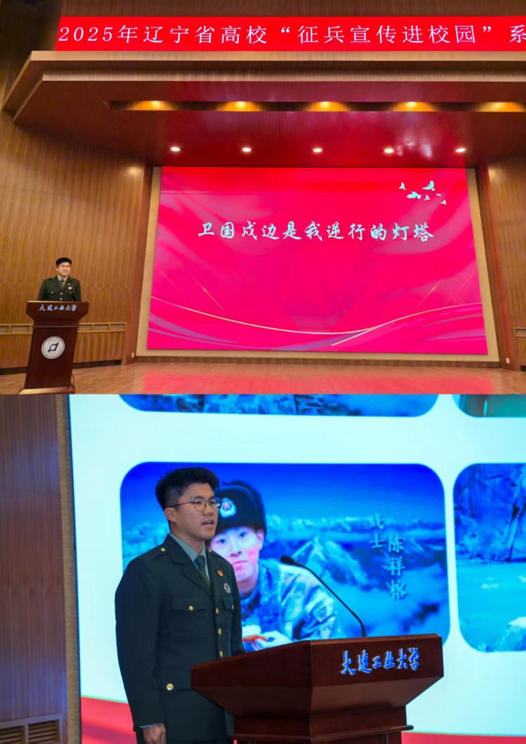 为充分发挥先进典型的示范引领作用,吸引更多大学生携笔从戎、建功军营,根据省大学生征兵工作服务中心的工作安排,省内各校择优推荐了一批优秀教师和学生参加征兵宣讲活动,经省级评审组初审、复审,最终确定10名教师、15名学生组成宣讲团,我校护理学院辅导员西艾力·衣孜木和第一临床学院退役大学生朴津葫成功入选宣讲团,于11月29日下午在大连工业大学进行了征兵宣讲。