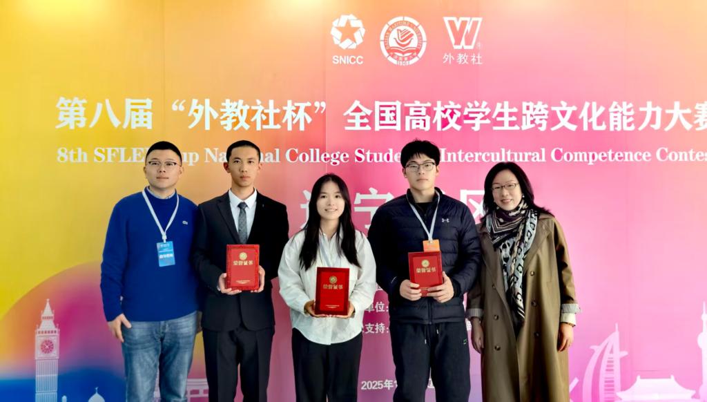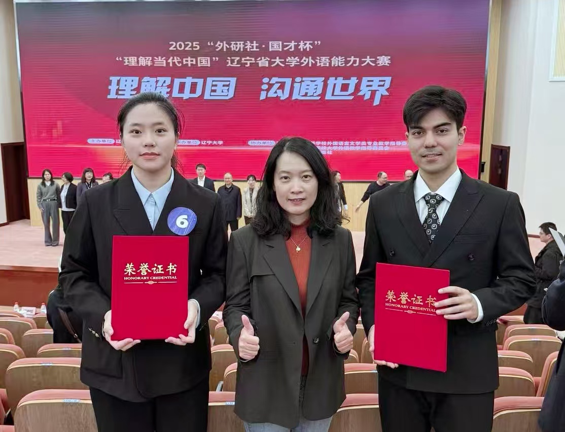 同时,10月18-19日于大连海事大学举办的第八届“外教社杯”全国高校学生跨文化能力大赛辽宁赛区比赛中,由杨春会、高峰两位老师共同指导,2023级附属第一医院临床医学专业熊泰慧敏、丁康旭、马奕明三位同学组成的校代表队团结协作、表现出色,最终荣获辽宁省二等奖。