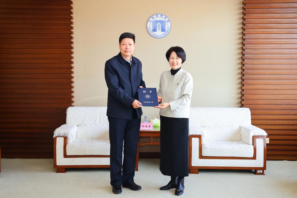 刘莹代表学校对杨金生教授一行的到来表示热烈欢迎。她指出,杨金生教授在中医基础理论研究、非遗传承、标准制定、国际交流等方面经验丰富,享誉国内外。她希望以此次聘任为契机,进一步推动双方在师资建设、人才培养、中医药对外交流等方面的深度合作,对我校中西医结合学科与针灸推拿学专业建设给予大力支持,助力中西医结合学科实现高质量发展。