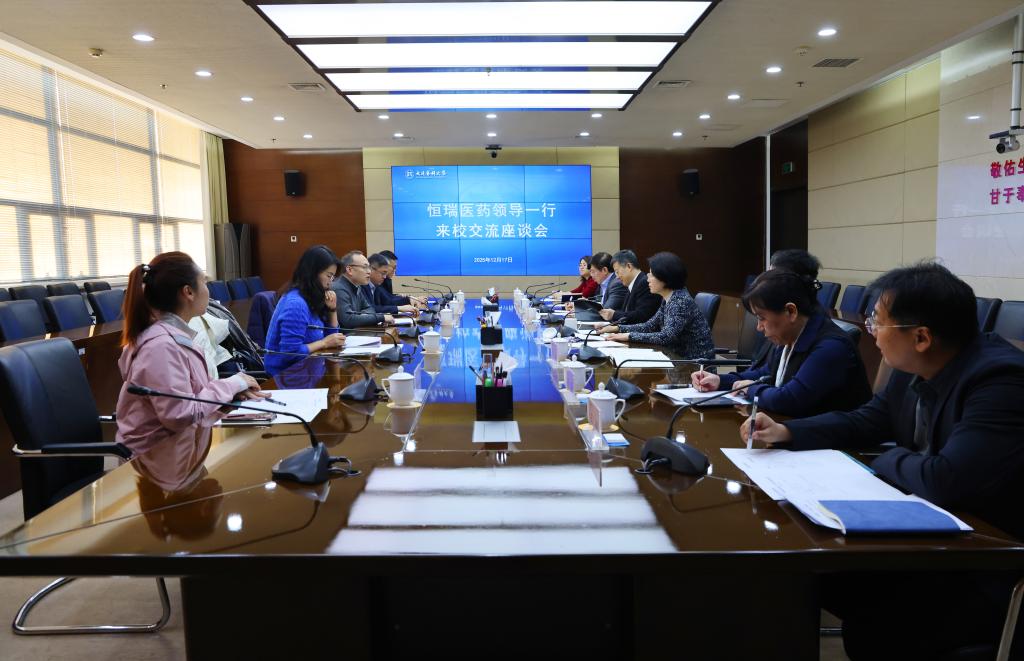 12月17日下午,恒瑞医药战略总监陈号一行到访我校,双方围绕人才培养、学科建设、临床科研等方面展开交流座谈。学校党委书记李海洋,党委副书记、校长刘莹,副校长夏云龙及相关部门负责人出席座谈。