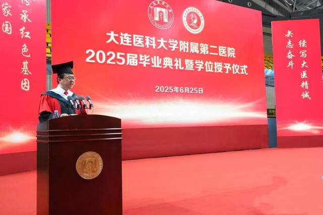 在庄严肃穆的国歌声中,毕业典礼暨学位授予仪式正式开始。首先,刘志宇院长对顺利完成学业的559名研究生、350名本科生表示祝贺,向关心、爱护和培养学生的老师和家长致以最衷心的感谢和崇高的敬意。在全体师生的积极参与、全程见证及倾力奉献下,医院连续六年荣膺全国三级公立医院绩效考核国家监测指标A+等级,稳居辽南首位、全国百强行列。多年来,附属第二医院始终坚持贯彻落实立德树人根本任务,牢记为党育人、为国育才初心使命,以培养堪当民族复兴大任的时代新人为己任,倾力学生成长成才,助力学生职业发展,在教育教学工作中取得了令人瞩目的优异成绩。2025届本科生考研率59.09%,再创新高;升学率69.14%,勇夺全校桂冠;应届毕业生住培结业考试通过率97.22%,执业医师考试通过率100%,双双刷新历史纪录;近30名硕士毕业生以优异成绩考入首都医科大学、浙江大学医学院、天津医科大学等顶尖学府深造;242名本科生成功踏入北医、华西、中山等名校殿堂;众多毕业生已活跃在北医、上医、华西等国内知名医院的工作岗位上,崭露头角!