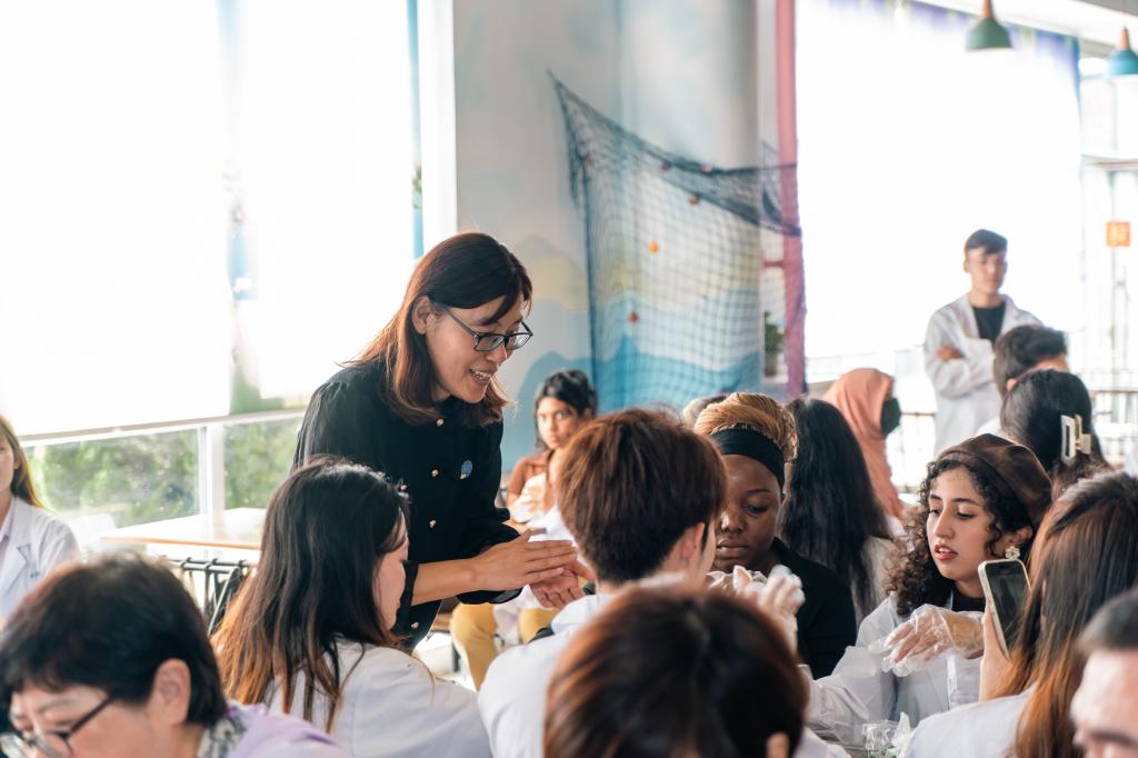 最受师生欢迎的当属月饼制作体验环节。活动现场精心准备了冰皮、馅料、模具等材料,专业厨师与学院老师共同坐镇指导。留学生们热情高涨,纷纷围在操作台前,认真学习包馅、揉团、压模等步骤。从小心翼翼地将馅料裹进冰皮,到用心按压出精致的花纹,每一个步骤都充满了好奇与专注。当一个个造型各异、软糯可爱的冰皮月饼新鲜出炉时,大家脸上都洋溢着成就感,纷纷拿起自己的作品与同伴分享,在亲手制作的过程中,不仅体验了传统美食的制作乐趣,更感受到了中秋“分享”与“团圆”的温馨氛围。