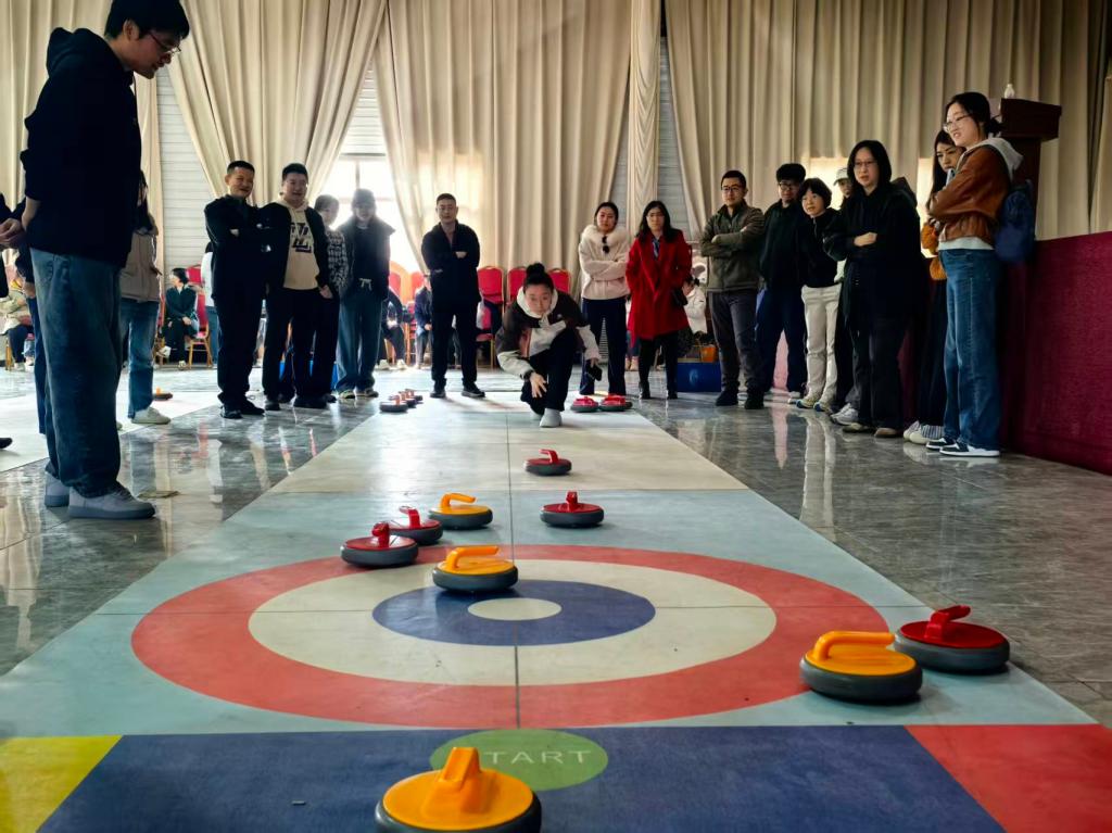 比赛过程中,各参赛队的成员迅速进入状态,有的教职工专注瞄准,小心翼翼调整投壶角度;有的与队友低声商议战术,分析场地局势;场边未参赛的教职工则化身“拉拉队”,为队友呐喊助威,每当有队伍投出精准的“占位壶”或“得分壶”,现场便响起阵阵欢呼。