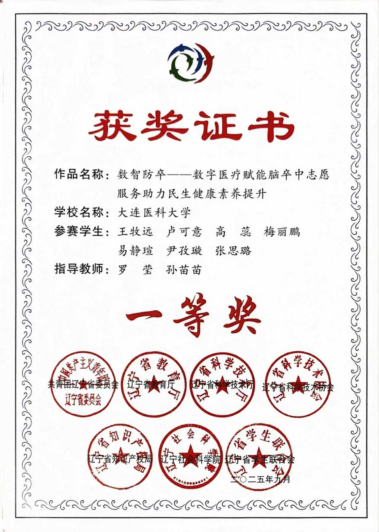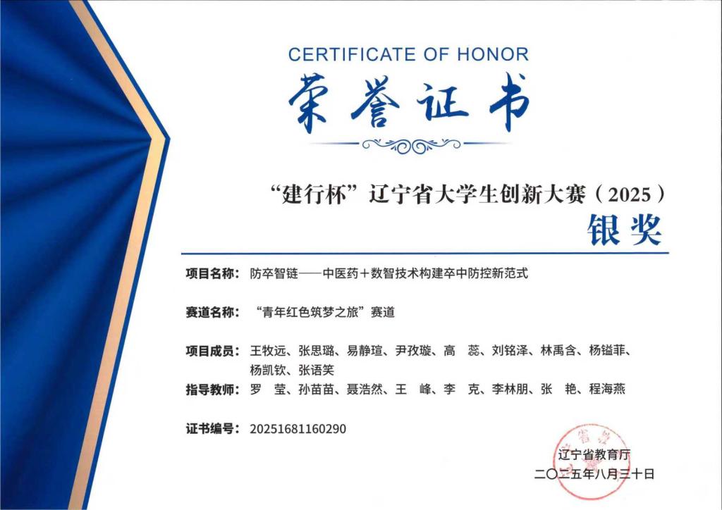 在今年7月举行的"建行杯"辽宁省大学生创新大赛(2025)总决赛中,由医学影像学院王牧远同学担任负责人,张思璐等同学参与,医学影像学院党总支书记罗莹担任第一指导教师完成的"防卒智链——中医药+数智技术构建卒中防控新范式"项目荣获“青年红色筑梦之旅”赛道银奖。同时该项目获得第十七届“挑战杯”辽宁省大学生课外学术科技作品竞赛一等奖。