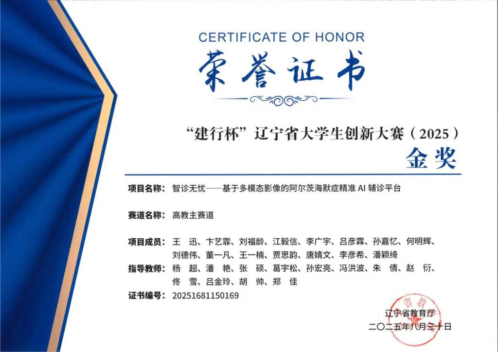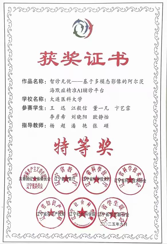 10月31日至11月3日,第十九届“挑战杯”全国大学生课外学术科技作品竞赛决赛在南京大学举行。由医学影像学院王迅同学担任负责人,卞艺霏、董一凡等同学参与,医学影像学院院长杨超教授担任第一指导教师完成的"智诊无忧——基于多模态影像的阿尔茨海默症精准AI辅诊平台"项目,荣获国赛主体赛一等奖,实现了学院在该项赛事中的历史性突破,也是学校近10年来最好成绩。