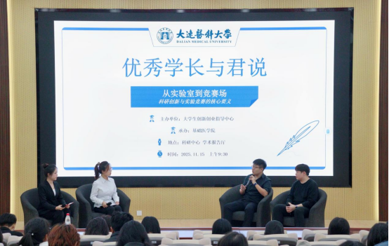 11月15日,由校大学生创新创业指导中心主办、基础医学院承办的第八期“优秀学长与君说——从实验室到竞赛场”科研分享会,在科研中心学术报告厅举行。基础医学院2023届生物制药专业本科毕业生李天琦、2024届生物制药本科毕业生王寿乐作为优秀校友应邀主讲,结合自身研究生阶段科研竞赛实践,分享实操经验,为基础医学院学风建设注入朋辈新动能。