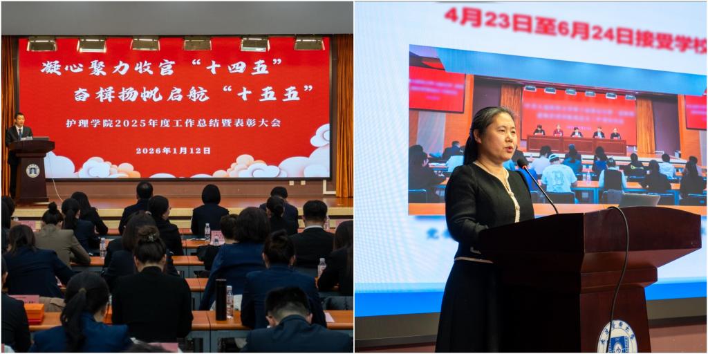 1月12日,护理学院2025年度工作总结暨表彰大会在图书馆举行。护理学院原院长、大连市护理学会理事长沙丽艳,学校各职能部门负责同志,学院全体教职工,附属医院、教学基地教师代表以及学生代表共120余人参加会议。会议由学院党总支书记兼副院长霍小舟主持。