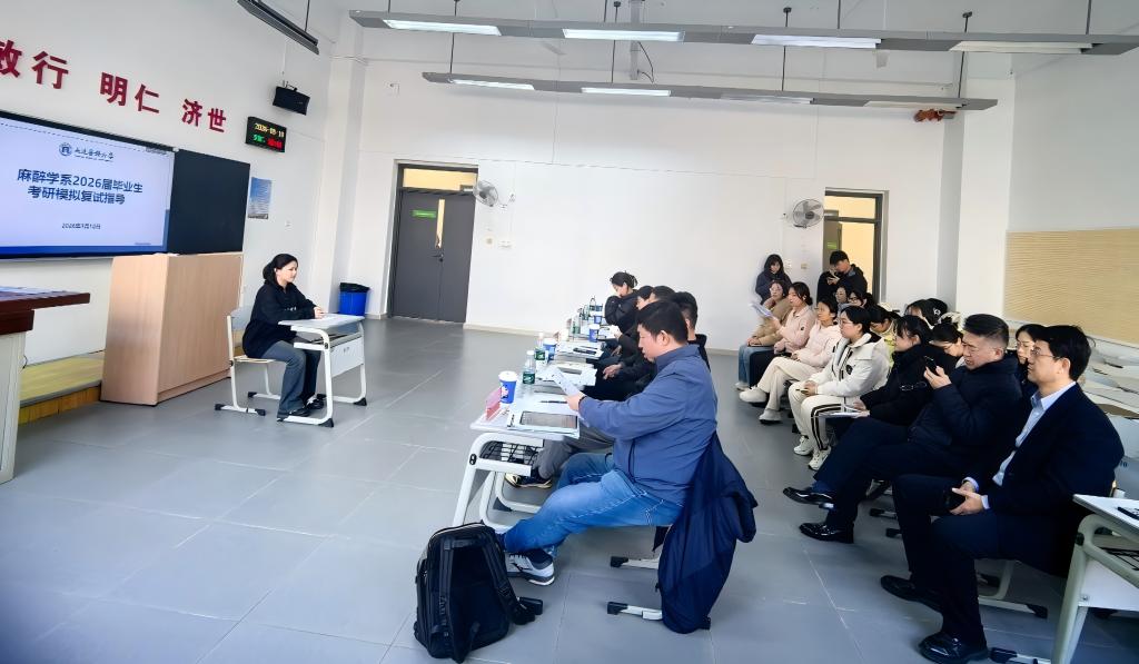 3月10日,麻醉学系在教学楼B区教室为2026届毕业生举办考研复试能力提升专题指导培训会,麻醉学系领导闻庆平、林敏现场观摩并与学生进行交流。
