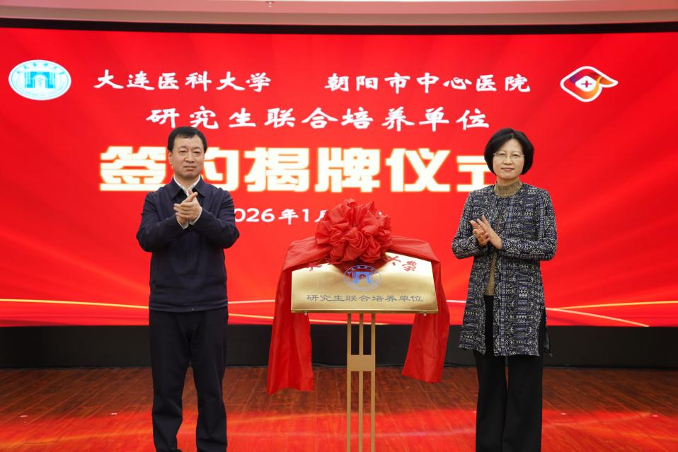 刘莹与刘力东共同为“大连医科大学研究生联合培养单位”揭牌,标志双方合作正式启动。