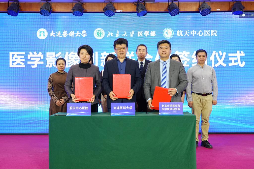 会上,刘志宇、韩鸿宾、王冠分别代表大连医科大学、北京大学医学部医学技术研究院、航天中心医院共同签署了“医学影像创新联合体”战略合作协议。医学影像学院院长杨超就学院医工交叉课程共建、研究生联合培养等方面进行了介绍。