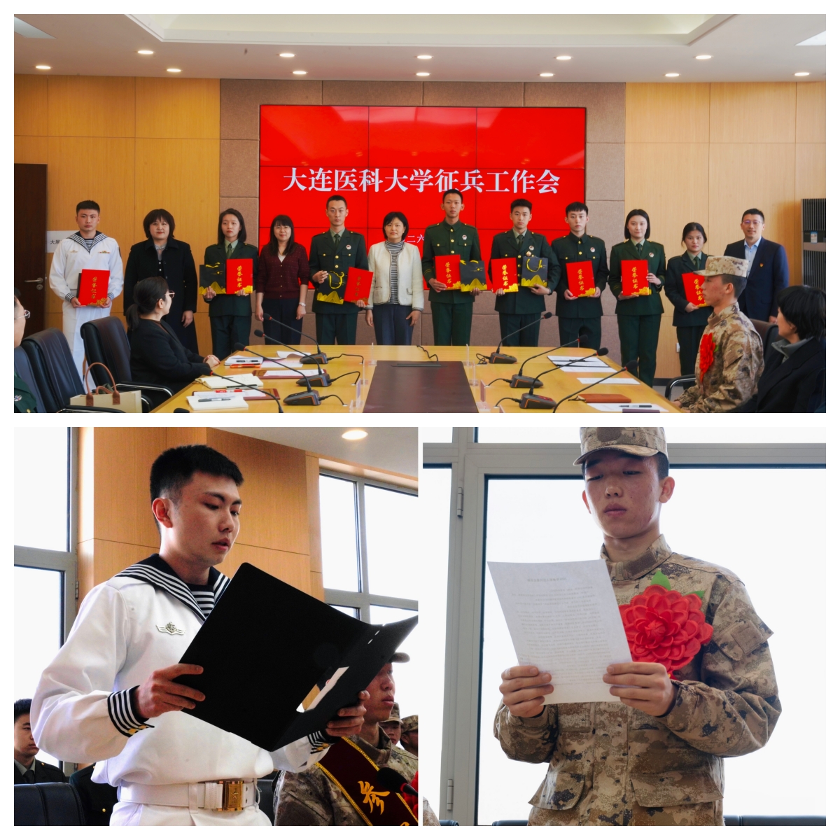 杨晓丽、苍健为即将踏入军营的2026年春季入伍大学生佩戴“参军光荣”绶带并颁发纪念品。退役大学生士兵代表2020级应用心理学专业毛宗正和入伍学生代表2024级预防医学专业程博敬发言,他们表达了大医学子传承红色基因,赓续英雄精神,以青春之我守护盛世中华的坚定决心。