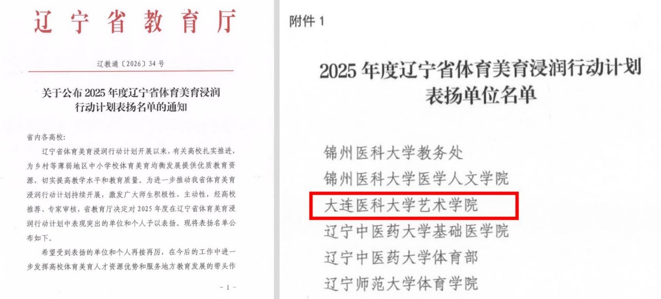 近日,辽宁省教育厅发布《关于公布2025年度辽宁省体育美育浸润行动计划表扬名单的通知》,我校艺术学院获评“辽宁省体育美育浸润行动计划表扬单位”,刘路遥老师获评“2025年度辽宁省体育美育浸润行动计划表扬教师志愿者”。