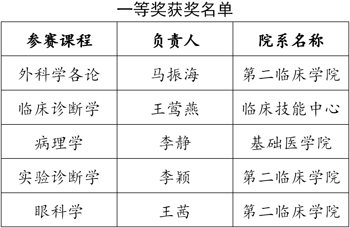 经评选,第二临床学院马振海等5位教师获一等奖,第一临床学院江星池等5位教师获二等奖,口腔医学院杨雪等7位教师获三等奖,中西医结合学院潘韬文等6位教师获优秀奖;基础医学院、第一临床学院、第二临床学院获优秀组织奖。